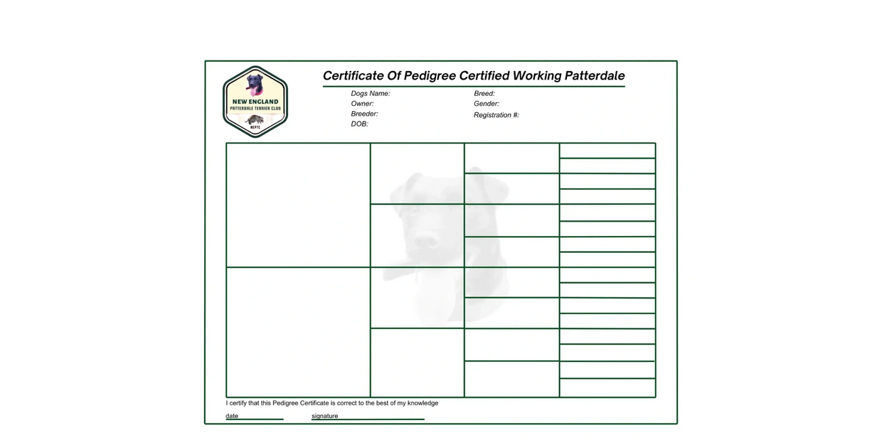 Both Parents have to be registered with the NEPTC in order to get a copy of your puppies/litters Pedigree